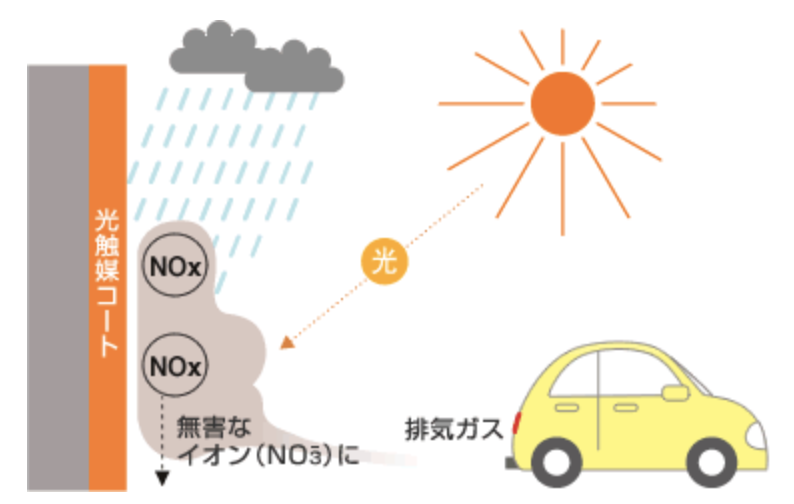 光触媒の壁で365日セルフクリーニングする外壁を標準採用!お隣さんの家と比較されてしまう外壁をセルフクリーニングします。光触媒であるTiO2(酸化チタン)に紫外線が当たると、e-(電子)とh+(正孔)が発生。その後、空気中のO2(酸素)や、H2O(水)と反応を起こします。O2-(スーパーオキサイドイオン)、-OH(ヒドロキシラジカル)の活性種が発生し、汚れの有機物を分解します。※コーキングは、高耐久当社指定品です。オプションで、スーパーケイミューシールに変更可能です。