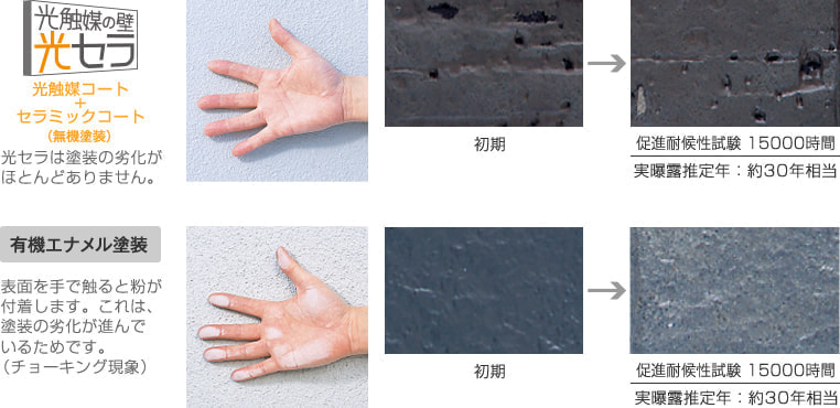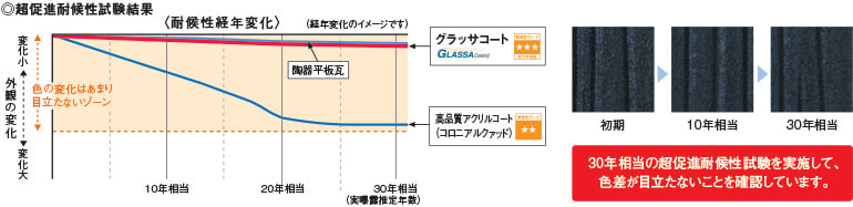 光セラの高い耐候性は、厳しい基準を設定した独自の促進耐候性試験によっても実証済み。